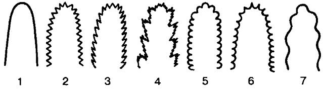 1 – цельнокрайний 2 – зубчатый; 3 – пильчатый; 4 – дваждыпильчатый; 5 – городчатый; 6 – выемчатый; 7 – волнистый |