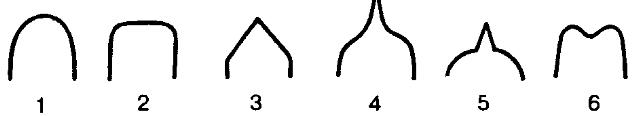 1 – тупая; 2 – усеченная; 3 – острая; 4 – заостренная; 5 – остроконечная; 6 – выемчатая |