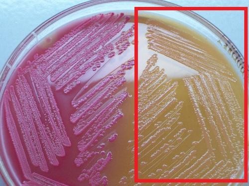 пищевых продуктов используют солевой агар с маннитом и феноловым красным. Штаммы S. aureus на этой среде образуют желтые колонии и вызывают изменение розового цвета среды на желтый. Коагулазоотрицательные стафилококки образуют красные колонии без изменения цвета среды (рисунок 1.41).