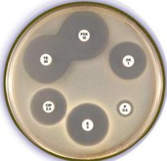 Рисунок 1.45 – Определение чувствительности стафилококков к антибиотикам диско-диффузионным методом. Заимствовано из Интернет-ресурсов.