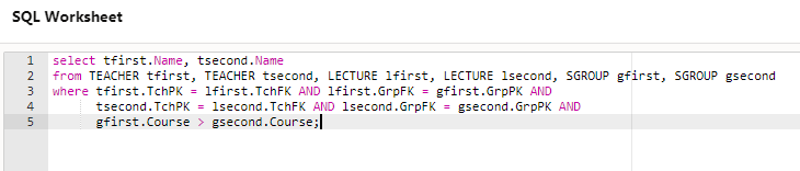 6) Вывести пары имен преподавателей, удовлетворяющих следующему условию: первый преподаватель преподает группе на курсе выше, чем курс группы, которой преподает второй преподаватель.