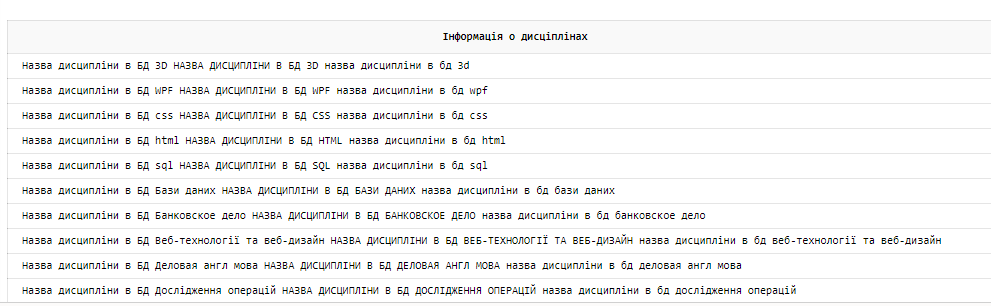 1) Название дисциплины в БД: <название дисциплины > Название дисциплины прописними буквами: <название дисциплины прописними буквами > Название дисциплины строчными буквами: <название дисциплины строчными буквами>