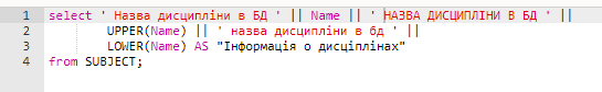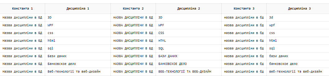 1) Название дисциплины в БД: <название дисциплины > Название дисциплины прописними буквами: <название дисциплины прописними буквами > Название дисциплины строчными буквами: <название дисциплины строчными буквами>
