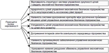 Охарактеризуємо принципи логіки керованості економічної безпеки підприємства. Відповідність структури і системи управління сукупності цілей і завдань економічної безпеки підприємства передбачає не лише навність у структурі управління підприємством функціонального підрозділу економічної безпеки підприємста, але і навності повноважень у керівника та провідних фахівців такого підрозділу щодо участі в ухваленні стратегічних управлінських рішень. Ієрархічність цілей управління економічною безпекою підприємства та їх несуперечливість на кожному рівні ієрархії має відповідати цілям узгодження інтересів внутрішнього середовища підприємства. Наявність системи однозначних критеріїв міри досягнення проміжних і кінцевих цілей управління економічною безпекою підприємства може варіювати відповідно до специфіки підприємств різної галузевої належності. Узгодженість цілей управління економічною безпекою підприємства та цілей його розвитку має перебувати у площині, щонайменше, стадій життєвого циклу підприємства. Дотримання інтересів агентів зовнішнього середовища підприємства має, у свою чергу, відповідати вимозі дотримання принципово важливих інтересів підприємста, управління економічною безпекою якого здійснюється. Наявність організаційного забезпечення та урахування наявних ресурсних обмежень управління економічною безпекою підприємства є принципами, що мають забезпечувальний характер, їх недотримання може звести нанівець будь- які концептуальні положення такого управління.