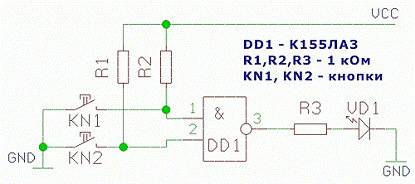 Как видно, к входам элемента подключены кнопки. Если же нажать одну из кнопок, то вход элемента через замкнутый контакт кнопки соединится с землей (GND), следовательно, на входе получим низкий уровень напряжения, т.е. логический ноль. Высокий уровень напряжения, логическую единицу соответственно, получим тогда, когда кнопка не будет нажата, т.к сопротивления R1 и R2 подключены к линии VCC.
