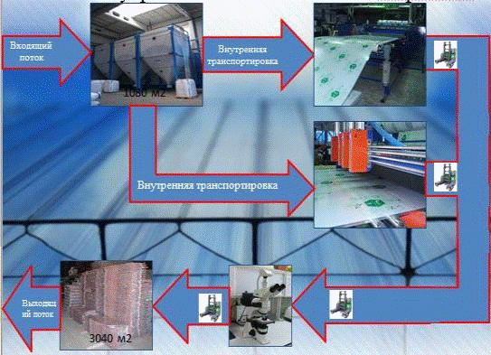 С помощью специального бокового погрузчика сотовые листы из поликарбоната перемещаются на склад готовой продукции. Монолитные листы и компаунды перемещаются на склад с помощью фронтального погрузчика. Контроль за перемещением готовой продукции осуществляется благодаря системе Активных Магнитных Носителей. Сотовые и монолитные листы из поликарбоната размещаются на складе готовой продукции на полках стеллажей и хранятся там до загрузки в автомобильный транспорт, идущий к потребителю.