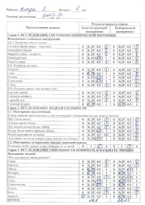 На этапе констатирующего эксперимента при исследовании состояния мимической моторики, подражательности, способности правильно интерпретировать чужие эмоции и называть их мы, в основном, опирались на методические рекомендации Г.А. Волковой. Также при подборе диагностического инструментария нами были использованы после определенной обработки материалы, предложенные Т.А. Фотековой [7; 52].