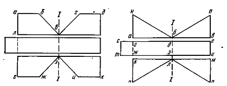 Высота боковых клиньев (например, ал на рис.3, а) равна половине высоты входа в мотню. При сшивании прямоугольной мотни клинья присоединяют к центральной плахе, сошворивают между собой кромки абв и вгд, а также кромки ежз и зик. Иногда клинья в мотне делают в форме не трапеций, а треугольников (рис.4, б). Однако клиновые мотни хуже раскрыты во время лова. Известны и другие конструкции мотен. Сшитую мотню часто укрепляют несколькими пожилинами из веревок, шнуров или тонких канатов, пропущенных вдоль мотни. Пожилины крепят к дели посадочной ниткой вплотную (огнива не провисают).