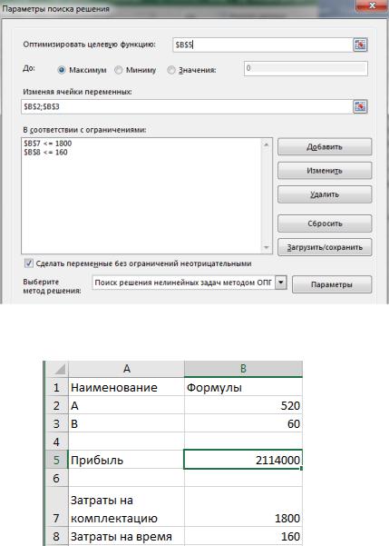Вывод. Из решения видно, что оптимальный план выпуска объективов составляет 520 штук вида А и 60 штук вида В. При этом максимальная прибыль составит 2114000 рублей.