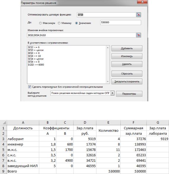 Находим суммарную заработную плату по кажжой должности. Находим оптимизированное решение . Вводим ограничения по количеству сотрудников инженер и лаборант.