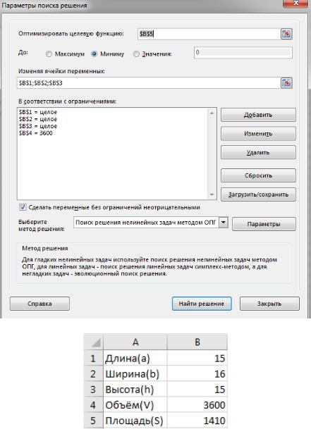 Спроектировать емкость - параллепипед с объемом V= a· b· h = 3600 (длина, ширина, высота). Емкость должна иметь минимальную площадь стенок