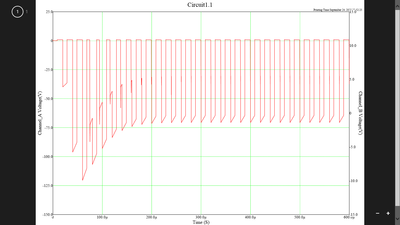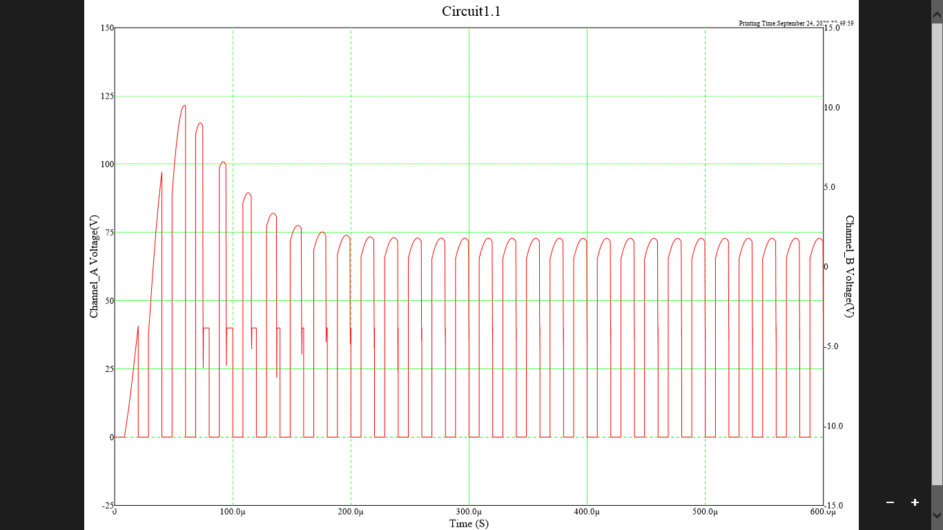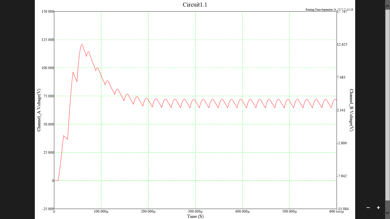 - в установившемся режиме работы схемы максимальные значения напряжения на транзисторе и диоде составили 72,08 В и 70,53 В соответственно;