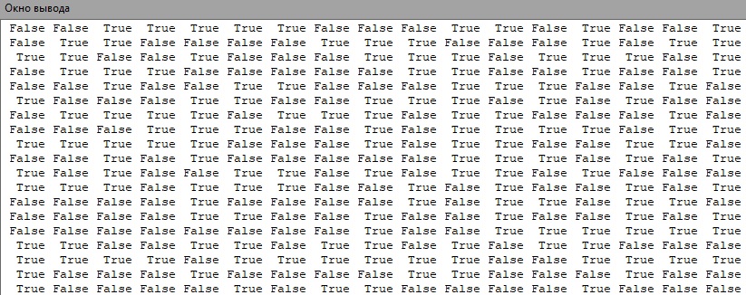На экран вывелся массив в виде матрицы 19 х 17 из случайных значений True и False, созданных предыдущей программой.