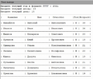 Результат записи данных в файл из задания № 3 полностью восстановлен и выведен на экран в виде таблицы 1.