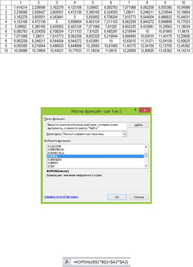 Для этого в крайнем левом столбце и крайней верхней строке нужно записать длины катетов треугольника (прогрессия от 1 до 10 с шагом 1), как показано на рисунке: