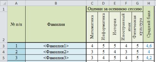 2.6.Настройте для таблицы успеваемости автоматический расчѐт среднего балла в столбце H.