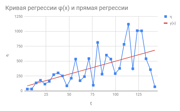 Построим кривую регрессии φ(x) и прямую линию линейной регрессии, уравнение которой было найдено выше: