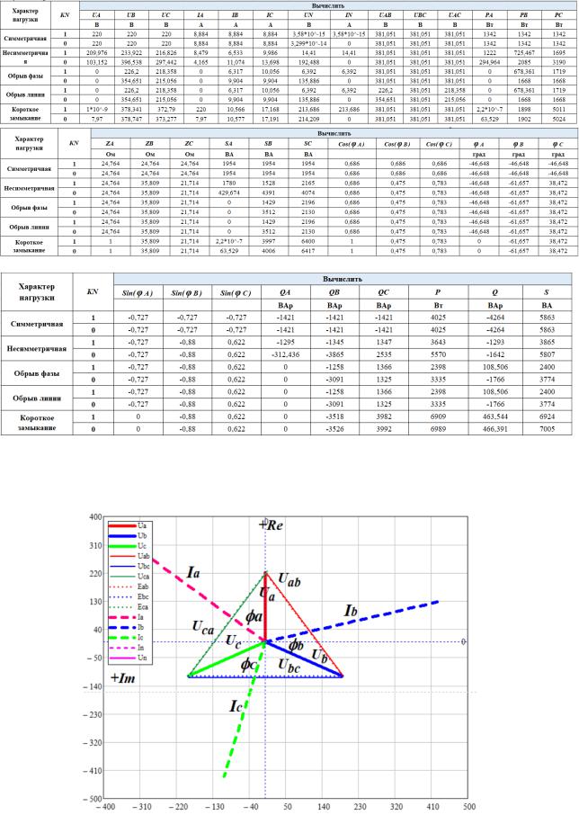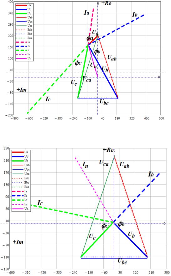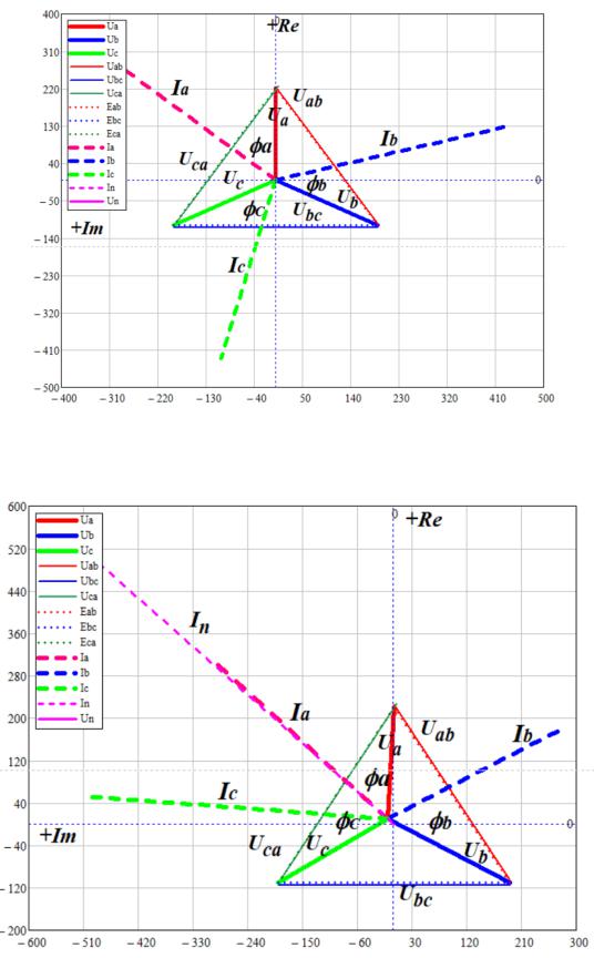 4.1.4. Векторная диаграмма напряжений и токов для несимметричной нагрузки при выключенном проводе нейтрали.
