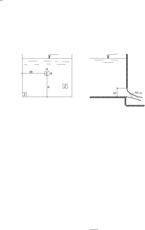 С о в е р ш е н н о е с ж а т и е - сжатие, возникающее, когда боковые стенки и дно сосуда практически не оказывают влияние на степень сжатия струи (не влияют на истечение). Такое сжатие получается, когда отверстие расположено достаточно далеко от боковых стенок и дна сосуда при условии (рис. 2, отверстие1): m>3a; n>3a.