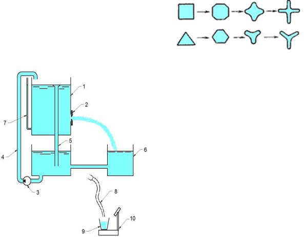 Как видно из рисунка, струя, вытекающая из квадратного отверстия, приобретает на некотором расстоянии крестообразную форму, что является следствием инерционных свойств жидкости и действия сил поверхностного натяжения.