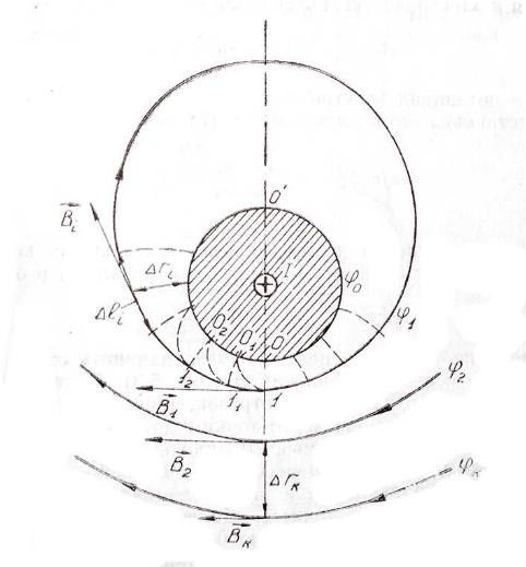 Разбиение контура целесообразно начинать от точки 0, лежащей на оси симметрии карты (рис.3). Вдоль контура электрода влево откладывают отрезок, длина которого равна кратчайшему расстоянию ri, от точки 0 до соседней линии 1, и получают точку 01. Из точки 01 проводят плавную линию (практически прямую) до пересечения с линией 1 так, чтобы она была перпендикулярна к эквипотенциали 0 в точке 01 и к эквипотенциали 1 в точке l1. Далее от точки 01 откладывают отрезок, равный расстоянию 01 – l1 и т. д. до точки 0’. Затем подобное построение проводят вправо от точки 0 до точки 0’.