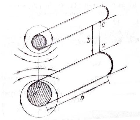 Сопоставляя выражения (4), (6) и (7), находим индуктивность, приходящуюся на единицу длины проводников (погонную индуктивность)