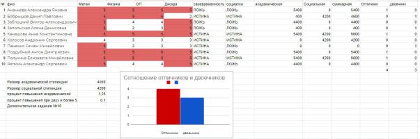 В ходе выполнения работы была создана таблица для рассчета стипендии студентов. Пятерки автоматически выделяются красным цветом, рассчет академической стипендии с учетом надбавок и своевременности сдачи сессии происходит по формуле. Начисление социальной стипендии происходит при наличии соответствующего основания. В столбце суммарная вычисляется полная стипендия, которую получает студент. Представлена столбчатая диаграмма, показывающая соотношение отличников и двоечников в группе.