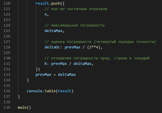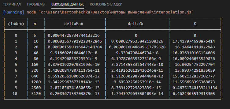 Напишем программу, которая выводит таблицу со столбцами n, deltaMax, deltaOc, K.