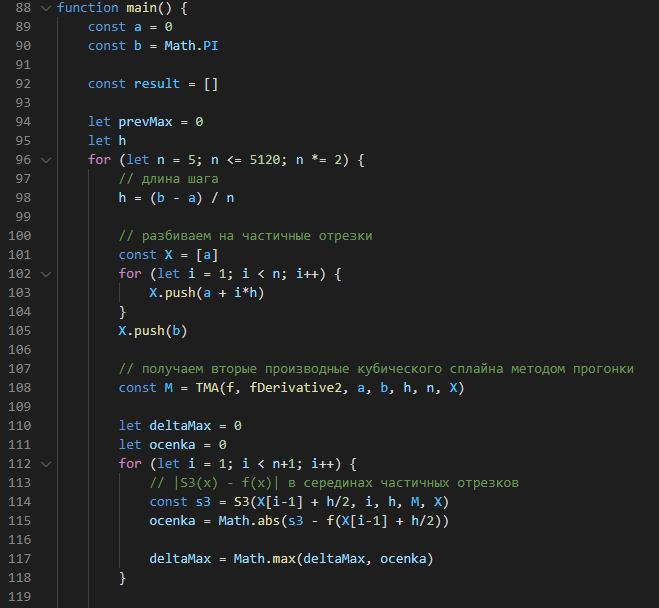 Написать программу для интерполирования функции sin x на отрезке [0 .. π] с помощью сплайна третьей степени, использования краевых условий б и метода прогонки. Вывести в таблицу значения максимальной погрешности и оценку погрешности при различном количестве отрезков разбиения n (5, 10, 20, …).