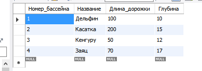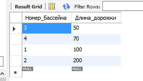 Сделаем выборку в таблице «Бассейн» по номеру бассейна и длине дорожки и отсортируем по возрастанию по длине дорожки.