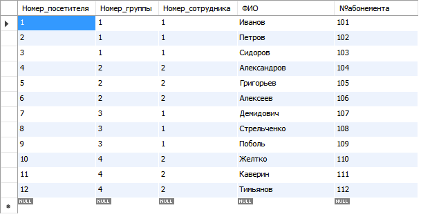 Сделаем выборку по двум таблицам – группа и посетитель; определим, какие посетители относятся к группе «Юниоры».