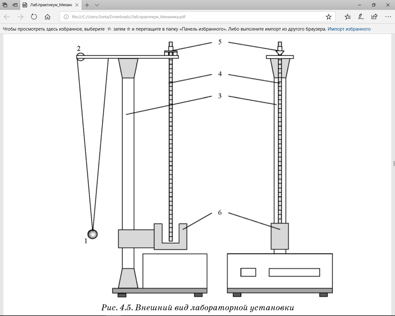 Установка состоит из математического и физического маятников. Математический маятник выполнен в виде металлического шарика 1 на бифилярном подвесе 2. Длина подвеса измеряется линейкой на стойке 3. Физический маятник есть металлический стержень 4, на котором крепится подвижная ось – опорная призма 5. Фотодатчик 6 на нижнем кронштейне сигнализирует о прохождении маятником положения равновесия. Время измеряется миллисекундомером, а число колебаний специальным счетчиком. Прибор включается нажатием кнопки “Сеть”. Кнопка “Сброс” служит для установки нуля. Нажатие кнопки “Стоп” выключает прибор после окончания текущего колебания. Для упрощения измерения расстояния на стержне через каждый сантиметр нанесены риски. Кроме того, на установке имеется специальная измерительная линейка.