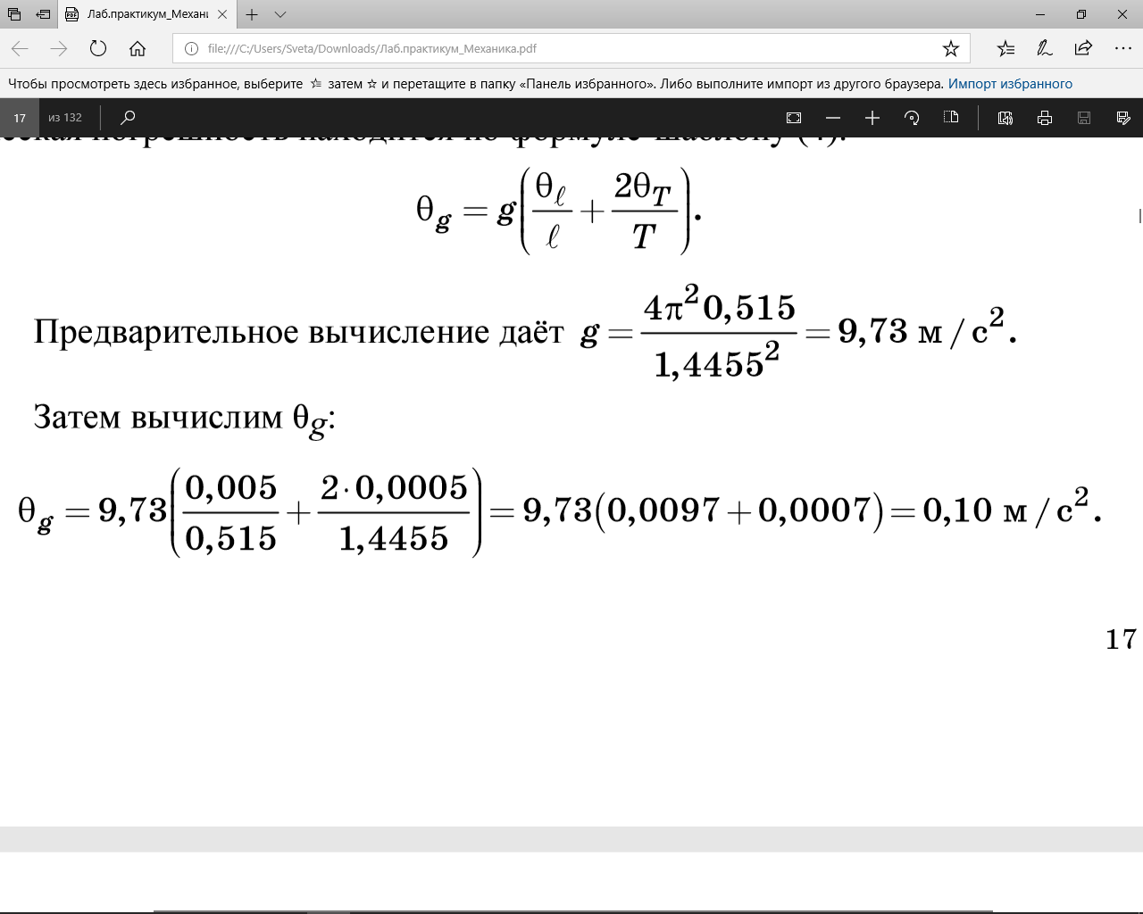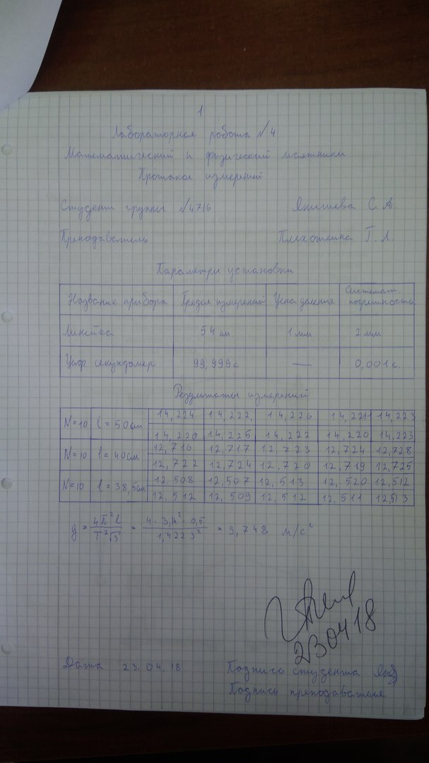 Вывод: При измерениях математическим маятником ускорение свободного падения равно g = = (9,74 ± 0,10) м/с2/