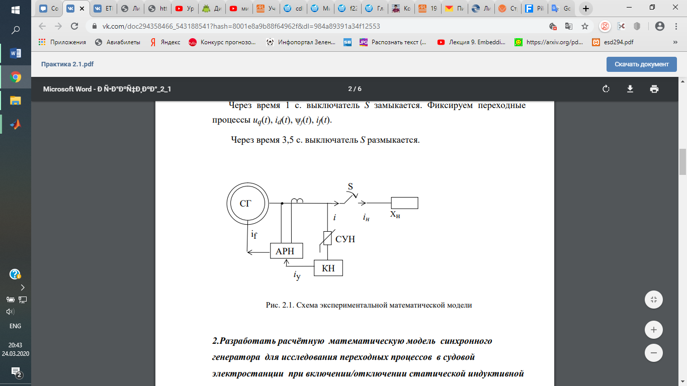 Цель занятия: на базе исходного математического описания разработать расчётную математическую модель судового синхронного генератора для исследования переходных процессов при включении и отключении индуктивной нагрузки.