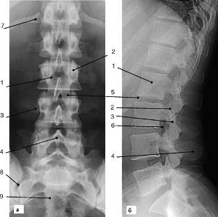 позвоночника в прямой (а) и боковой (б) проекциях: 1 - тело позвонка; 2 -