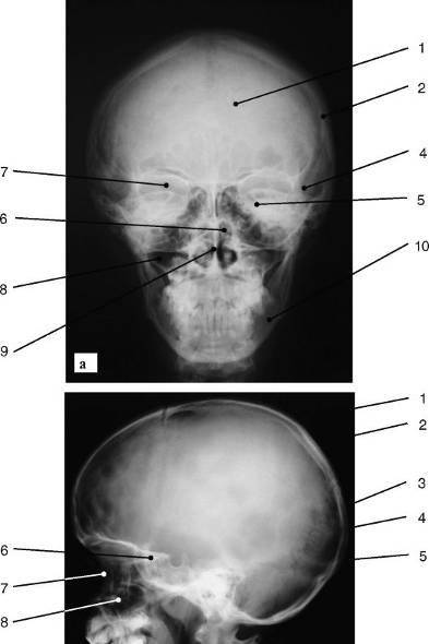 Обзорные рентгенограммы черепа в прямой и