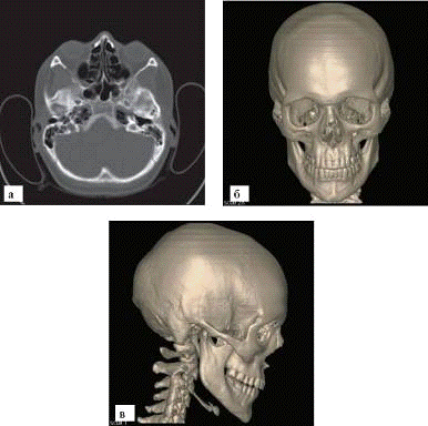 Рис. 5. МСКТ черепа: а - поперечный срез; б - трехмерная реконструкция, вид спереди; в - трехмерная реконструкция, вид сбоку ференцируются борозды оболочных артерий, каналы и звездчатые разветвления диплоэтических вен и пахионовых грануляций, а также пальцевые вдавления. Отдельные кости черепа соединяются между собой разного вида швами. В черепе ребенка места с неоконченным окостенением называются родничками.