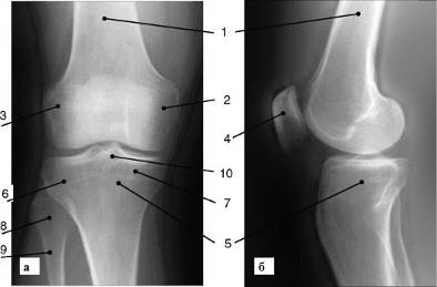 Рис. 6. Рентгенограмма коленного сустава (а - передняя; б - боковая проекция): 1 - бедренная кость; 2 - латеральный мыщелок бедренной кости; 3 - медиальный мыщелок бедренной кости; 4 - надколенник; 5 - большеберцовая кость; 6 - латеральный мыщелок большеберцовой кости; 7 - медиальный мыщелок большеберцовой кости; 8 - головка малоберцовой кости; 9 - шейка малоберцовой кости; 10 - межмыщелковое возвышения суставов широко используют МР-томографию и ультразвуковое исследование.