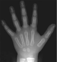 Рис. 9. Рентгенограмма кисти 3-летнего ребенка (норма). Видны широкие зоны роста и ядра окостенения