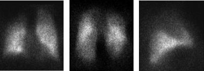Рис. 2. Сцинтиграммы легких в прямой передней (а), прямой задней (б) и правой боковой (в) проекциях при нормальной микроциркуляции в малом круге кровообращения.