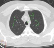 Легкие отображаются темно-серыми полями, на фоне которых видны продольные и поперечные сечения кровеносных сосудов, а также просветы бронхов, форма которых зависит от соотношения плоскости сканировании и плоскости расположения бронха.