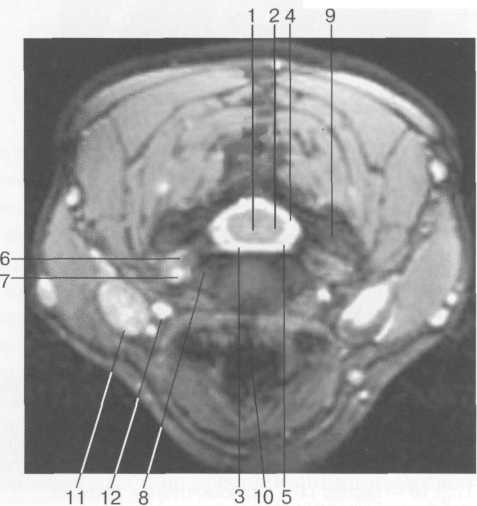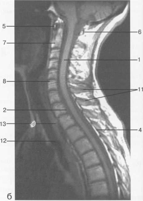 1 -- спинной мозг; 2 -- субарахноидальное пространство; 3 -- дуральный мешок (задняя стенка); 4 -- эпидуральное пространство; 5 -- передняя дуга С1; 6 -- задняя дуга С1; 7 -- тело С2; 8 -- межпозвонковый диск; 9 -- гиалиновая пластинка; 10 -- артефакт изображения; 11 -- остистые отростки позвонков; 12 -- трахея; 13 -- пищевод.