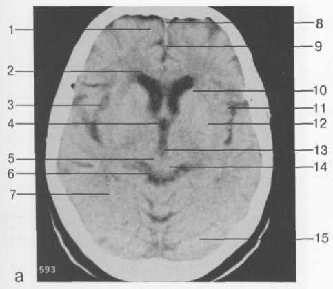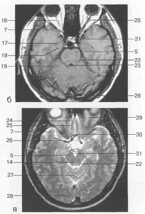 1 -- лобная доля; 2 -- лобный рог бокового желудочка; 3 -- латеральная щель мозга; 4 -- третий желудочек; 5 -- ножка мозга; 6 -- цистерна четверохолмия; 7 -- височная доля; 8 -- верхний сагиттальный синус; 9 -- серп мозга; 10 -- головка хвостатого ядра; 11 -- кора островка; 12 -- скорлупа; 13 -- внутренняя вена мозга; 14 -- четверохолмие; 15 -- полушарие мозжечка; 16 -- зрительный нерв; 17 -- височный рог бокового желудочка; 18 -- гиппокамп; 19 -- передняя долька мозжечка; 20 -- хиазма; 21 -- внутренняя сонная артерия; 22 -- охватывающая цистерна; 23 -- четвертый желудочек; 24 -- прямая извилина; 25 -- ольфакторная борозда; 26 -- средняя мозговая артерия; 27 -- червь; 28 -- затылочная доля; 29 -- клетчатка орбиты; 30 -- передняя мозговая артерия; 31 -- межножковая цистерна.