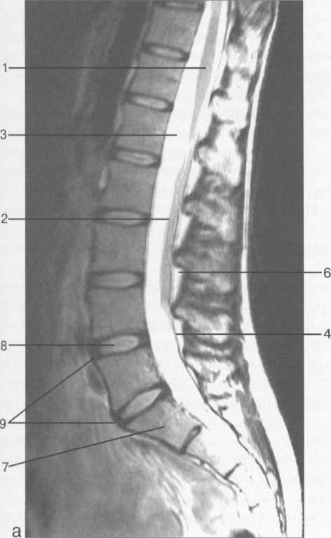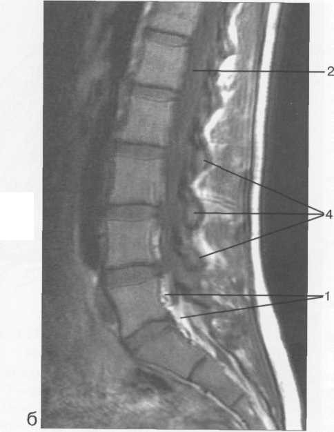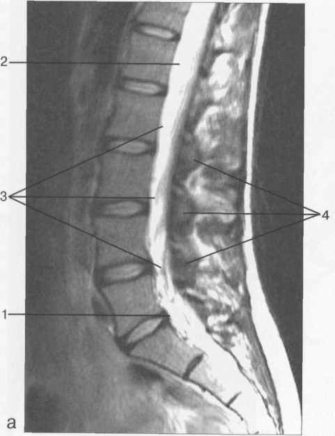 Рис. 37. Срединные сагиттальные МРТ пояснично-крестцового отдела позвоночника.