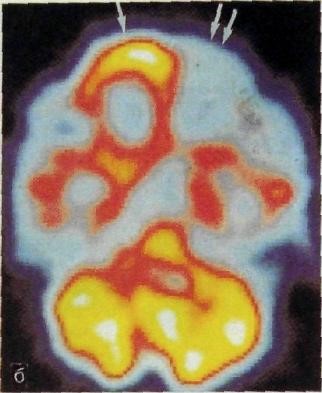 Исследование мозга методами радиоиуклидной диагностики ограничивается в основном получением функциональных данных. Принято считать, что величина мозгового кровотока пропорциональна метаболической активности головного мозга, поэтому, применив соответствующий РФП, например пертехнетат, можно выявить участки гипо- и гиперфункции (рис. 44).