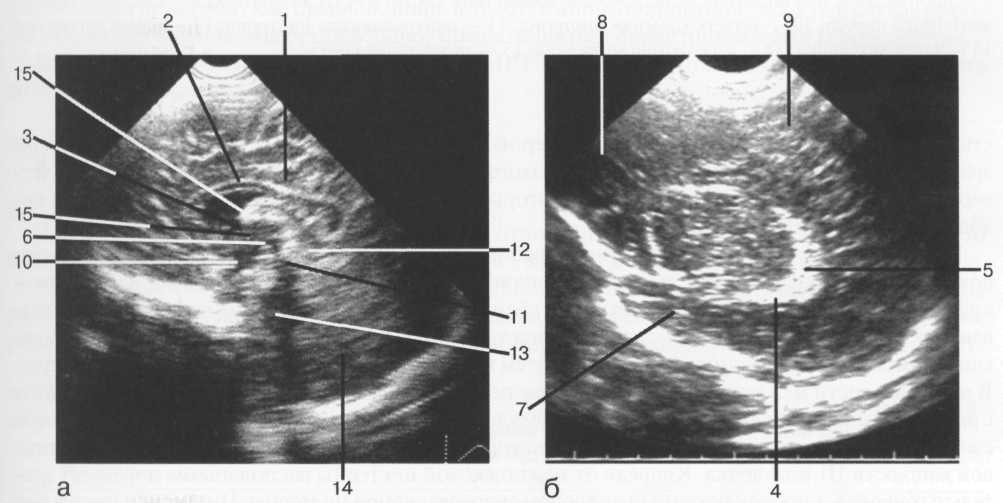 Рис. 42. Нейросонография. Изображения головного мозга в сагиттальной плоскости: а -- срединно-сагиттальный срез; б -- парасагиттальный срез через тела боковых желудочков.