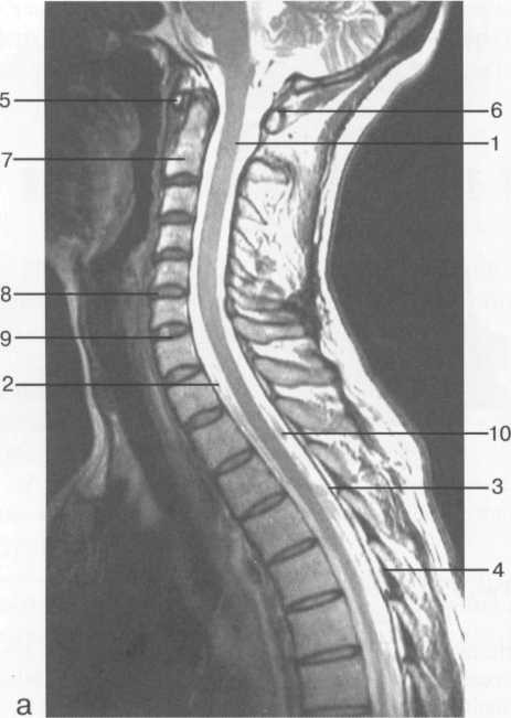 Рис. 38. МРТ. Срединное сагиттальное изображение шейного отдела позвоночника.