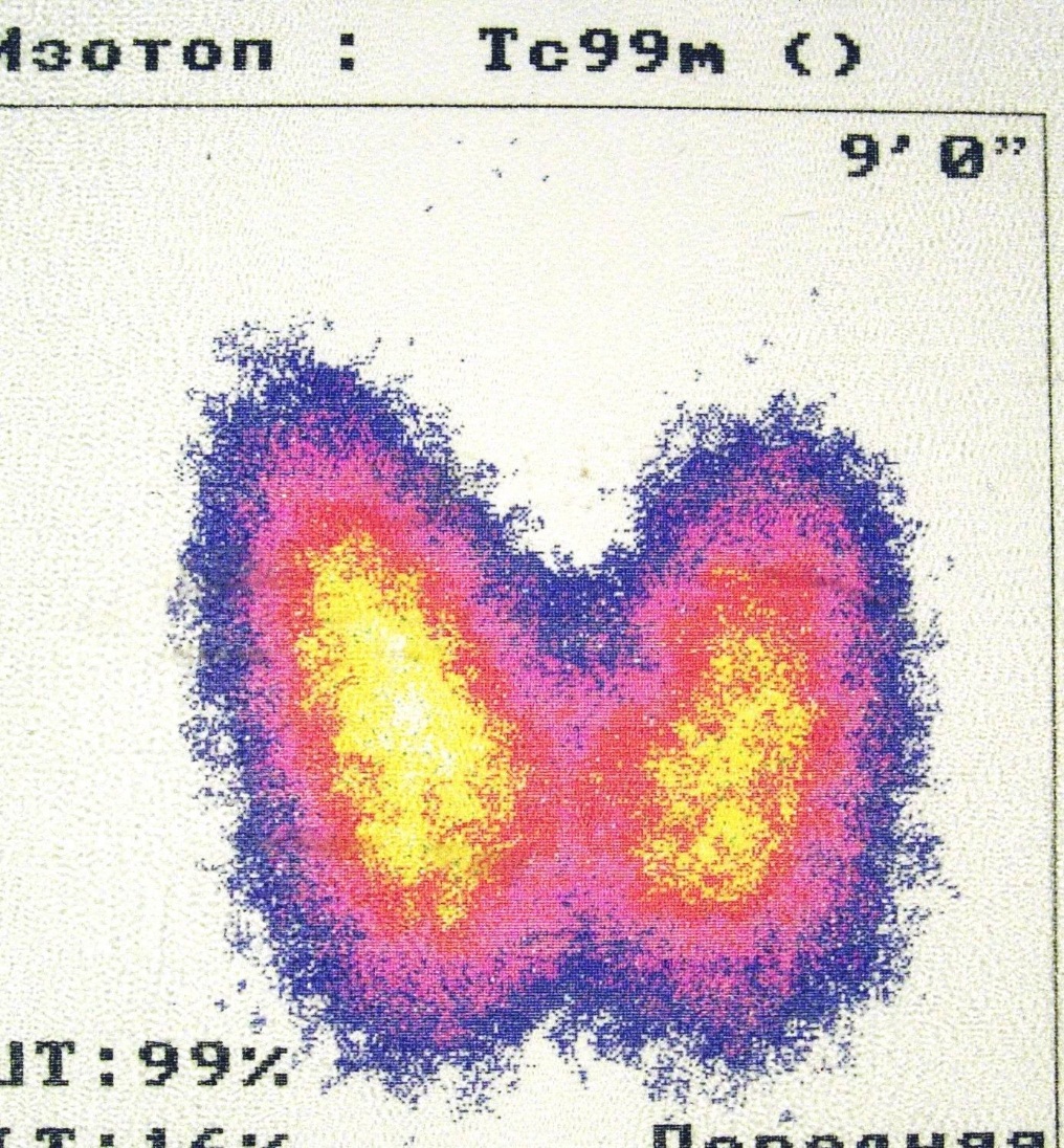 Для изучения формы ЩЖ а также определения степени накопления РФП применяется сцинтиграфия. Равномерное накопления РФП представлено на рис. 31.