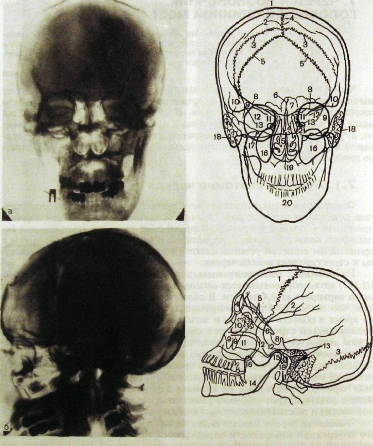 а -- прямая проекция: 1 -- наружная пластинка, 2 -- внутренняя пластинка, 3 -- венечный шов, 4 -- сагиттальный шов, 5 -- ламбдовидный шов, б -- лобный гребень, 7 -- лобные синусы, 8 -- верхние края малых крыльев основной кости, 9 -- височный край большого крыла основной кости, 10 -- верхние края пирамид височной кости, 11 -- верхушки пирамид, 12 -- глазницы, 13 -- отверстие канала зрительного нерва, 14 -- носовая перегородка, 15 -- носовые ходы, 16 -- верхнечелюстные пазухи, I/ -- подглазничное отверстие, 18 -- сосцевидный отросток, 19 -- верхняя челюсть, 20 -- нижняя челюсть, 21 -- клетки решетчатого лабиринта; б -- боковая проекция: 1 -- венечный шов, 2 -- костные борозды ветвей средней оболочечной артерии, 3 -- ламбдовидный шов, 4 -- лобные синусы, 5 -- дно боковых отделов передней черепной ямы, 6 -- основная пластинка, 7 -- дно среднего отдела передней черепной ямы, 8 -- турецкое седло, 9 -- скуловая кость, 10 -- клетки решетчатого лабиринта, 11 -- верхнечелюстные пазухи, 12 -- дно боковых отделов средней черепной ямы, 13 -- пирамиды височных костей, 14 -- угол нижней челюсти, 15 -- суставной отросток нижней челюсти, 16 -- венечный отросток нижней челюсти, 17 -- зубовидный отросток Си, 18 -- отверстие наружного слухового прохода.