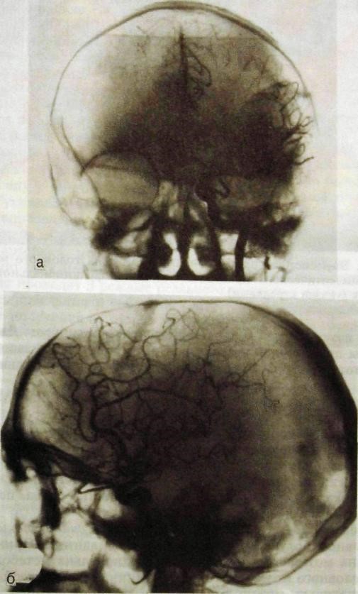 Рис. 43. Каротидные артериограммы черепа (норма), а -- прямая проекция; б -- боковая проекция.